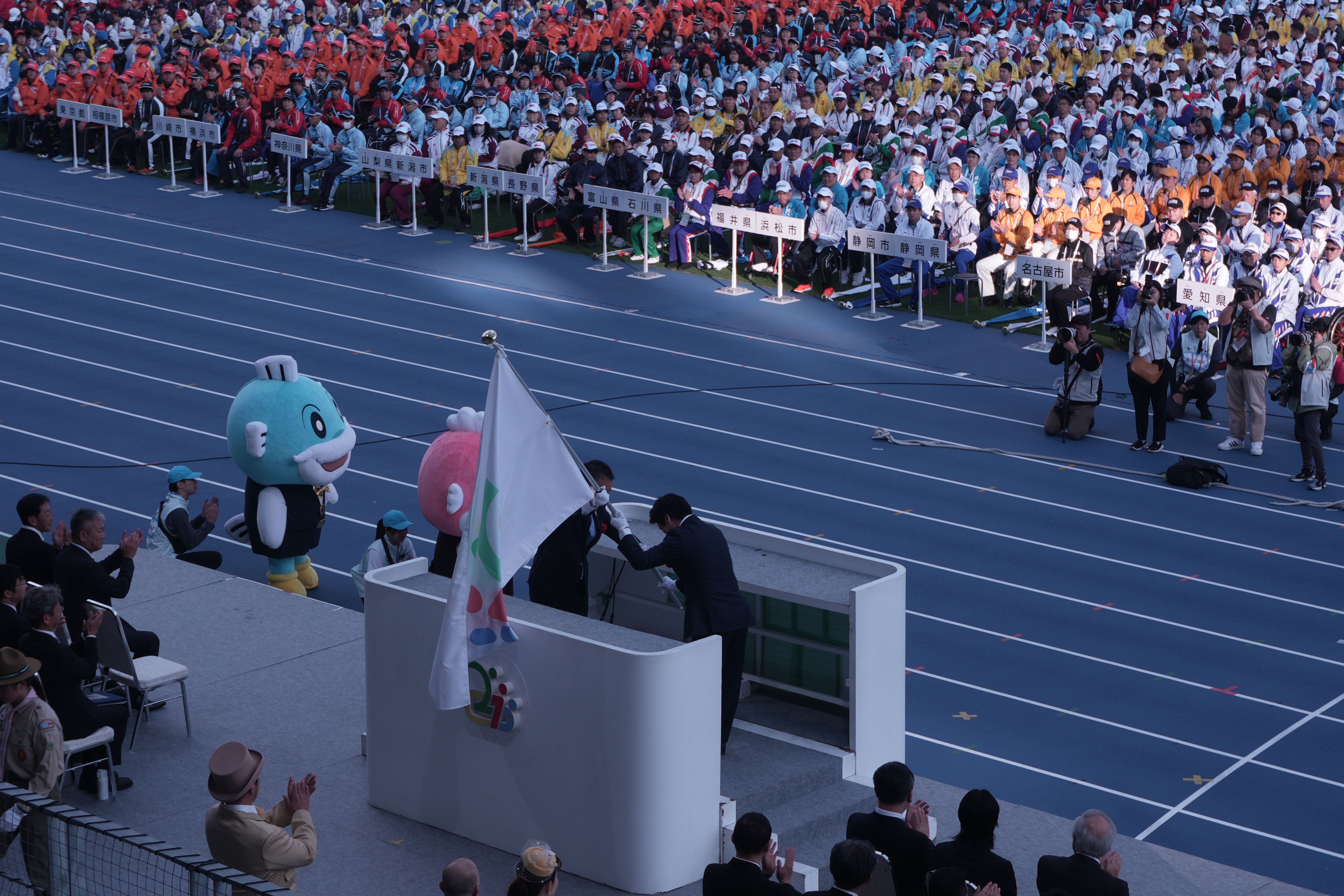 大会会長の三日月知事は、挨拶で、「この大会で得られた出会いや交流、経験を糧・励みに共に生きる『健康しが』をつくっていく」と力を込め、「このあと、大会旗は青森県へと引き継がれる。皆さんの新しい物語の始まりです。青のきらめき青森障スポの成功を願い、また皆さんのこれからの挑戦に心からのエールをお送りする」と話し、最後に「みなさん、また会いましょう!」と締めくくった。