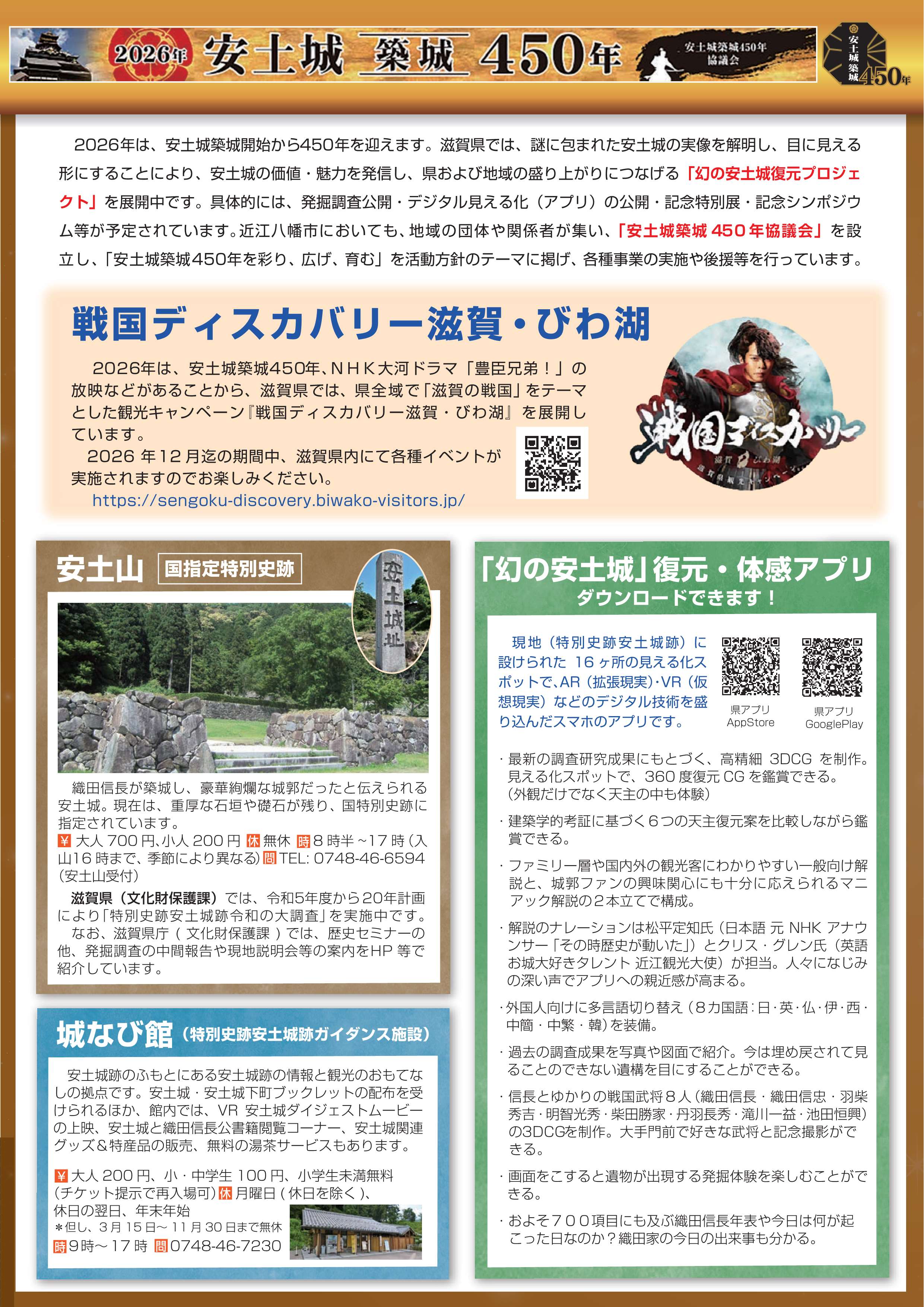 令和8年(2026年)は、織田信長が安土城築城を開始した天正4年(1576年)から数えて450年目にあたります。滋賀県では、安土城築城450年祭として、様々なイベントを計画しています。また、令和8年のNHK大河ドラマは「豊臣兄弟!」が放送されることから、滋賀県戦国観光キャンペーン「戦国ディスカバリー滋賀・びわ湖」を実施します。近江八幡市でも近江八幡市安土城築城450年協議会を発足し、様々な事業を予定しています。