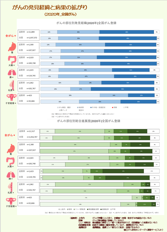 〔がんの発見経緯と病巣の拡がり(2021年全国がん登録 全国との比較)〕