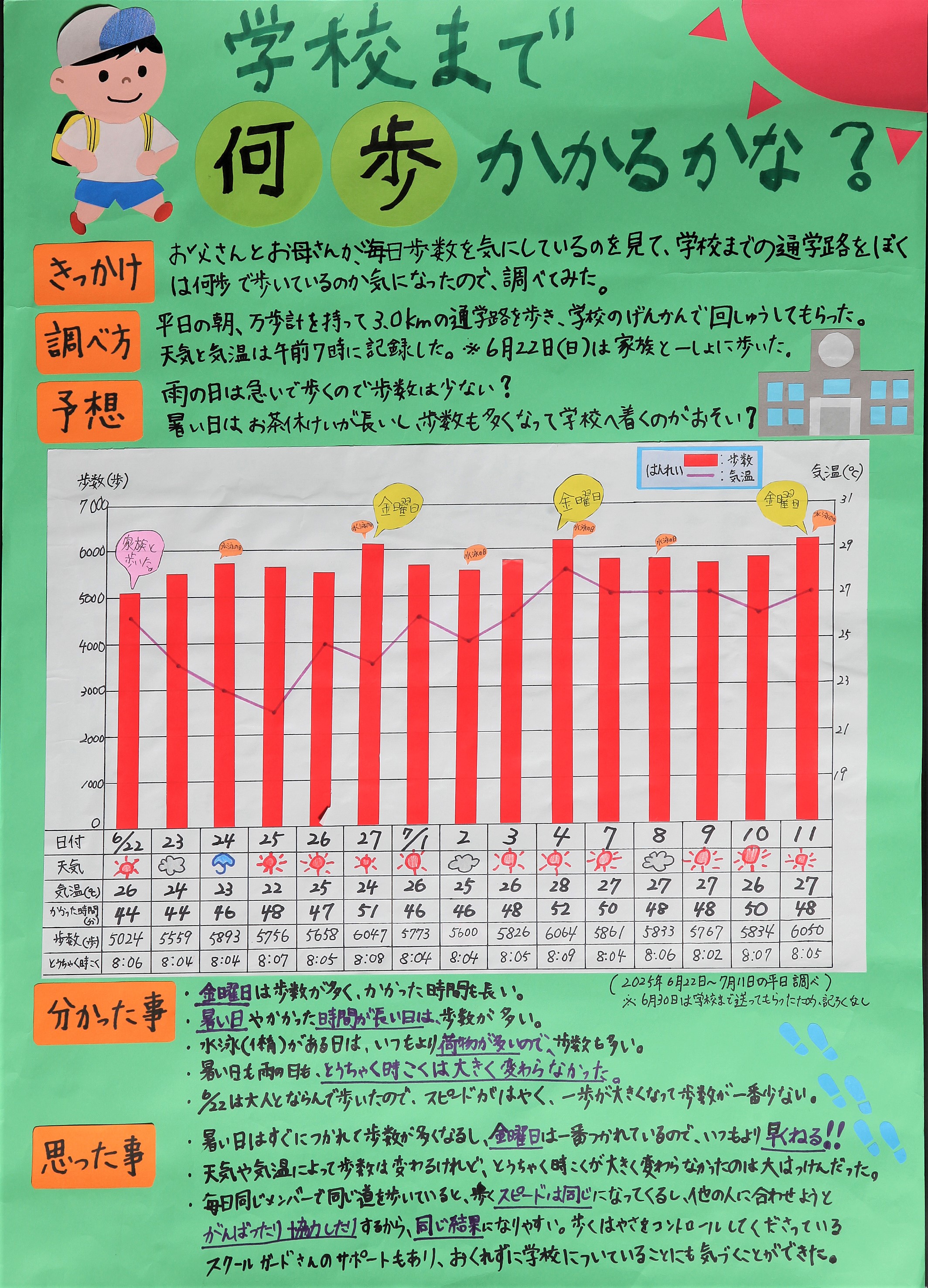 歩数を気にかけている家族の姿をよく観察し、自分事に置き換えて疑問を見つけている点に感心しました。天気も気温も日々変わる中での調査は簡単にはいかないものですが、万歩計を手に、集中してねばり強く歩数を数え、正確な数値としてまとめることができましたね。歩数や天候に加え、かかった時間や到着時刻なども正確に記録されており、信頼性の高い作品に仕上げることができています。調査を通して金曜日は歩数が多くなることを発見し、その原因を分析した上で対策まで考えられている点も素晴らしく、大変評価できます。