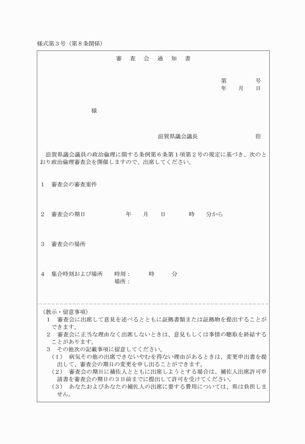 第8条 審査会が条例第6条第1項第2号の規定により議員等の出席を求めようとするときは、審査会通知書(別記様式第3号)により議長を経て行うものとする。