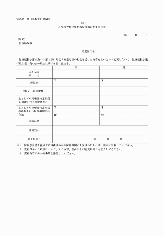 第6条の2 施行規則第7条の14の規定による届出は、小児慢性特定疾病指定医指定変更届出書(別記様式第8号)により行うものとする。