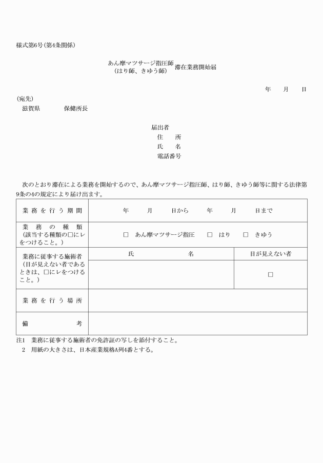 第4条 法第9条の4の規定による滞在による業務の開始の届出はあん摩マツサージ指圧師(はり師、きゆう師)滞在業務開始届(別記様式第6号)により知事に提出しなければならない。
