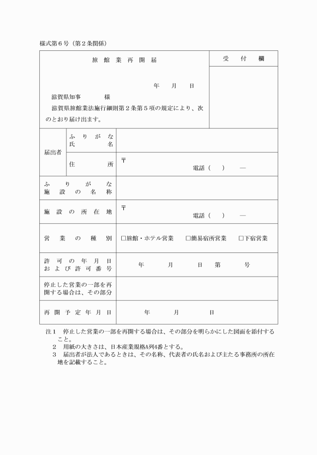 6 営業者は、停止した営業の全部または一部を再開しようとするときは、あらかじめ旅館業再開届(別記様式第6号)を知事に提出しなければならない。