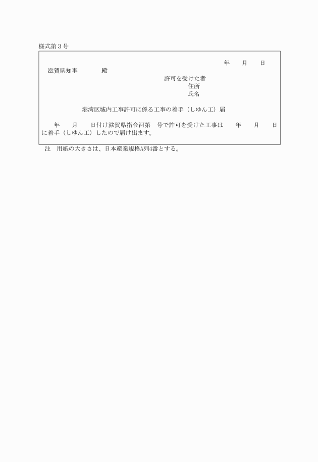 第4条 工事の許可を受けた者は、その着手およびしゆん工後すみやかに、それぞれ別記様式第3号の届書を知事に提出しなければならない。