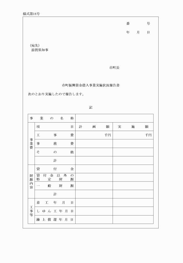 第15条 資金の貸付けを受けた市町は、翌年度の6月10日までに当該事業の実施状況について、市町振興資金借入事業実施状況報告書(別記様式第14号)により知事に報告しなければならない。