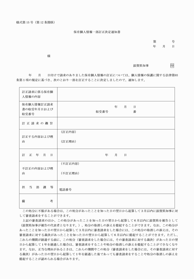 (保有個人情報の訂正通知書)