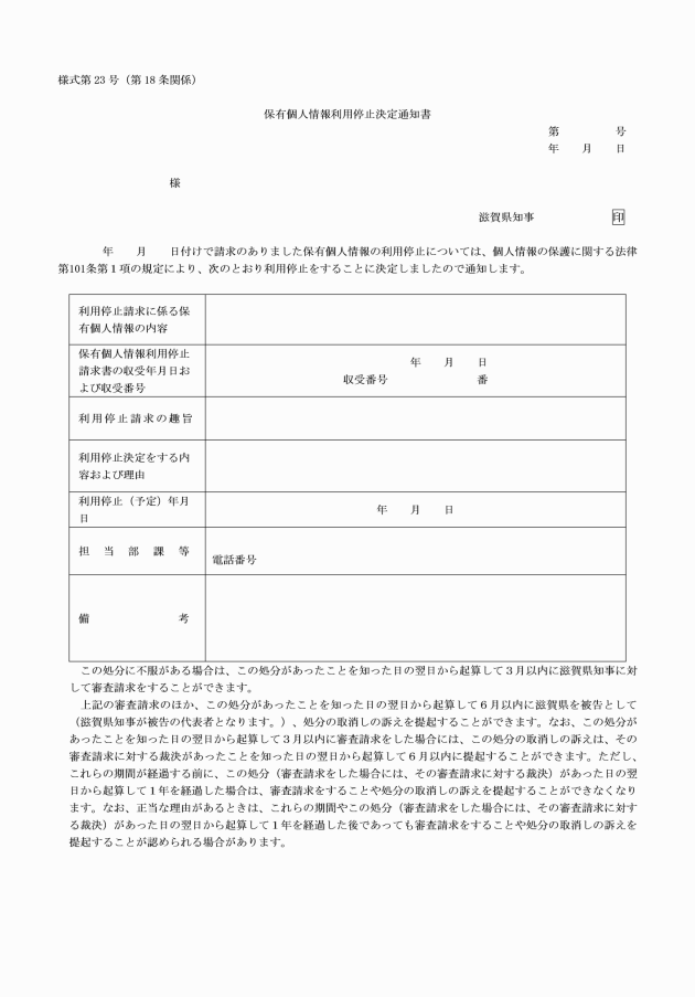 (1) 全部を利用停止する旨の決定 保有個人情報利用停止決定通知書(別記様式第23号)